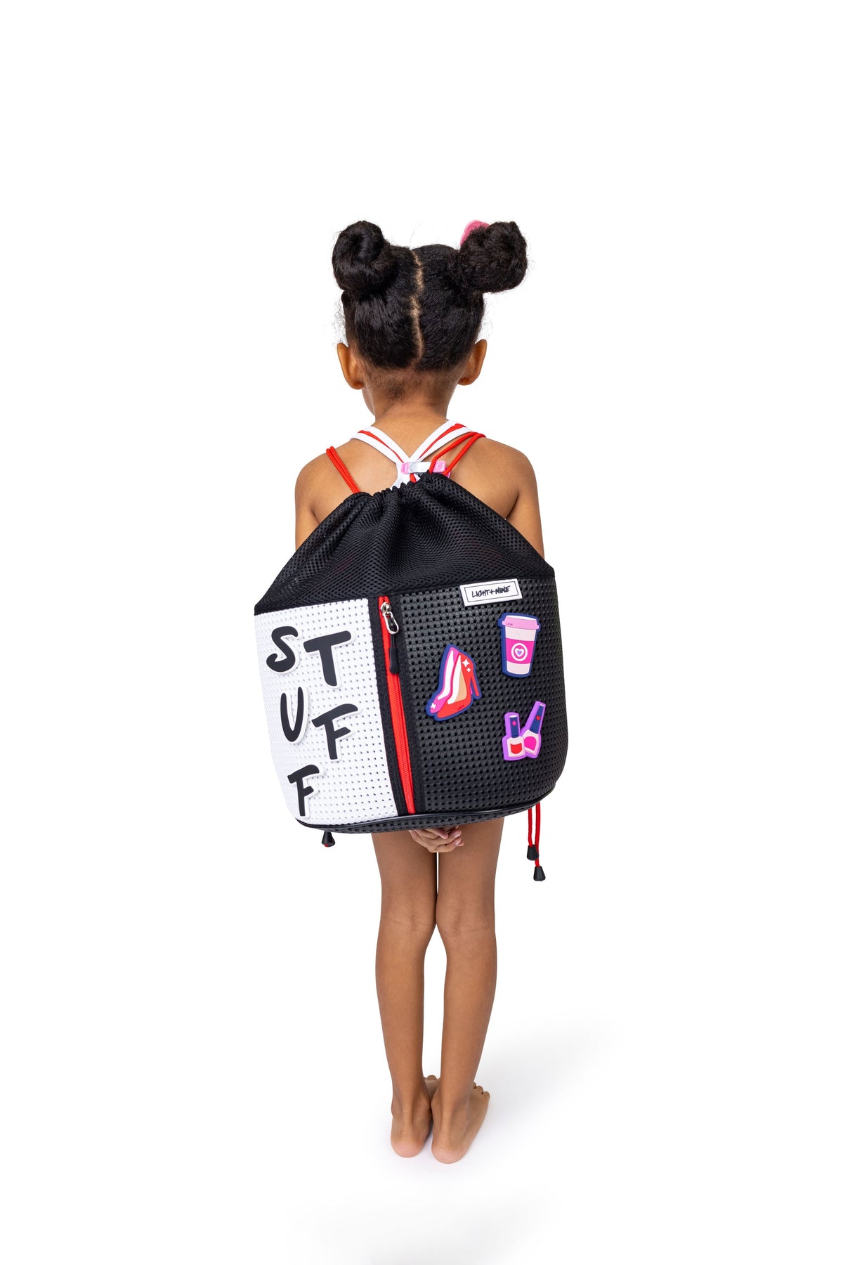 The perfect way for kids to carry all their swim, beach and travel needs. This drawstring bag is SUPER light and cool. Chic is size, but packs more than you can imagine.